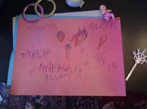 Last weekend I acquired a child-height, round, solid wood table from a friend. It was covered in crayon, marker, glue, Scotch tape, glitter, sticker trash and who knows what else. My friend told me that it used to be used in a children’s Sunday School class in Alabama.